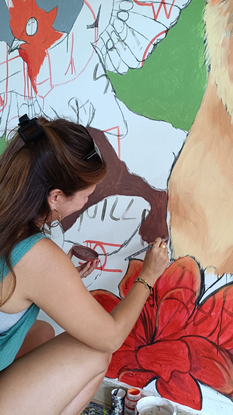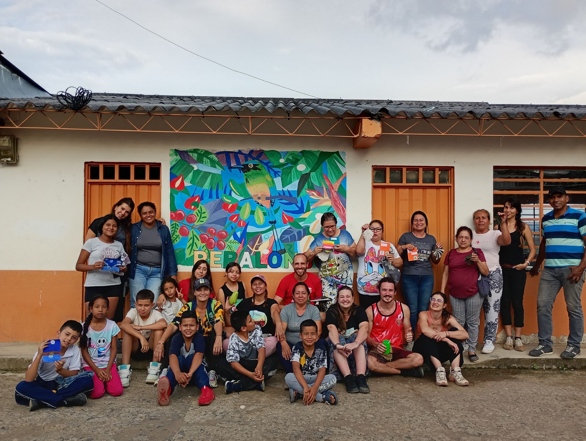 Quelques mois plus tard, en octobre, Anaïs a représenté Myosotis lors du festival « A la sombra del Tatamá » à Santuario. Pendant cet évènement, une rencontre pédagogique a réuni les élèves des six écoles bénéficiaires, qui ont présenté ensemble les produits cultivés dans leurs potagers, montrant avec fierté ce que l’éducation et l’agroécologie peuvent accomplir ensemble. Ce fut également l’occasion de participer à la réalisation collective de la fresque murale soutenue par Myosotis. Pensée de manière à égayer la maison de retraite de Santuario, où est installé un potager, la fresque rend hommage aux résidants et à leur culture paysanne traditionnelle.